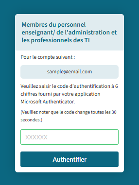 - Une fois cette opération effectuée, un code généré à six chiffres apparaîtra dans l’application utilisée pour capter le code QR. Après chaque connexion suivant la configuration de l’AMF, l’utilisateur sera redirigé vers une page lui demandant de saisir son code après avoir correctement saisi son nom d’utilisateur et son mot de passe. Veuillez noter que les codes expirent toutes les 30 secondes et qu’un nouveau code est généré et requis toutes les 30 secondes pour se connecter.